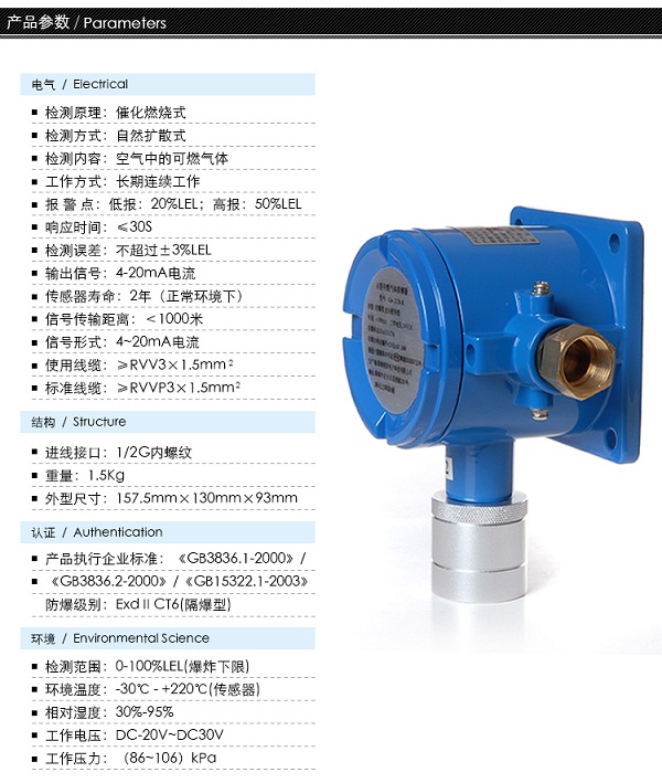 CA-217A-K防爆性能符合標準要求,屬隔爆型,防爆標志為EXdⅡCT6,是用于檢測空氣中可燃氣體的含量,當可燃氣體的濃度達到或高于預定水平時,探測器會輸出開關量信號給報警控制器,與開關量型可燃氣體報警控制器系列產(chǎn)品連接使用。