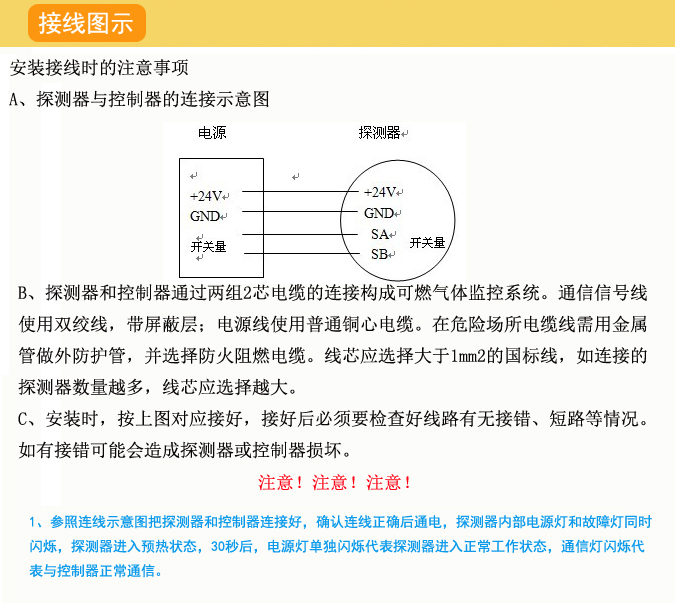 總線制分布的智能型可燃?xì)鉂舛葓?bào)警裝置,是經(jīng)過(guò)多年研發(fā)設(shè)計(jì),集高、精、尖技術(shù)一體的安全防護(hù)產(chǎn)品。其防爆性能符合標(biāo)準(zhǔn)要求,屬隔爆型,防爆標(biāo)志為EXdⅡCT6,是用于檢測(cè)空氣中可燃?xì)怏w的含量,當(dāng)可燃?xì)怏w的濃度達(dá)到或高于預(yù)定水平時(shí),探測(cè)器會(huì)輸出開(kāi)關(guān)量信號(hào)給報(bào)警控制器,與開(kāi)關(guān)量型可燃?xì)怏w報(bào)警控制器系列產(chǎn)品連接使用。本產(chǎn)品適用于餐館、酒店、鍋爐房、配氣站、石油、化工、制藥、焦化等防爆場(chǎng)所。