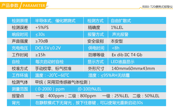 雙量程燃?xì)庑孤z測(cè)儀RBBJ-T20采用的是雙傳感器設(shè)計(jì)模式,從而實(shí)現(xiàn)了雙量程檢測(cè)的要求。這兩個(gè)量程分別為低濃度檢測(cè)(半導(dǎo)體傳感器)0-2000ppm,以光柱的形式顯示;高濃度檢測(cè)(催化燃式傳感器)0-100%LEL,以LCD大屏幕液晶顯示的方式顯示。兩個(gè)檢測(cè)模式可以輕松切換,實(shí)現(xiàn)兩級(jí)檢測(cè)報(bào)警功能。